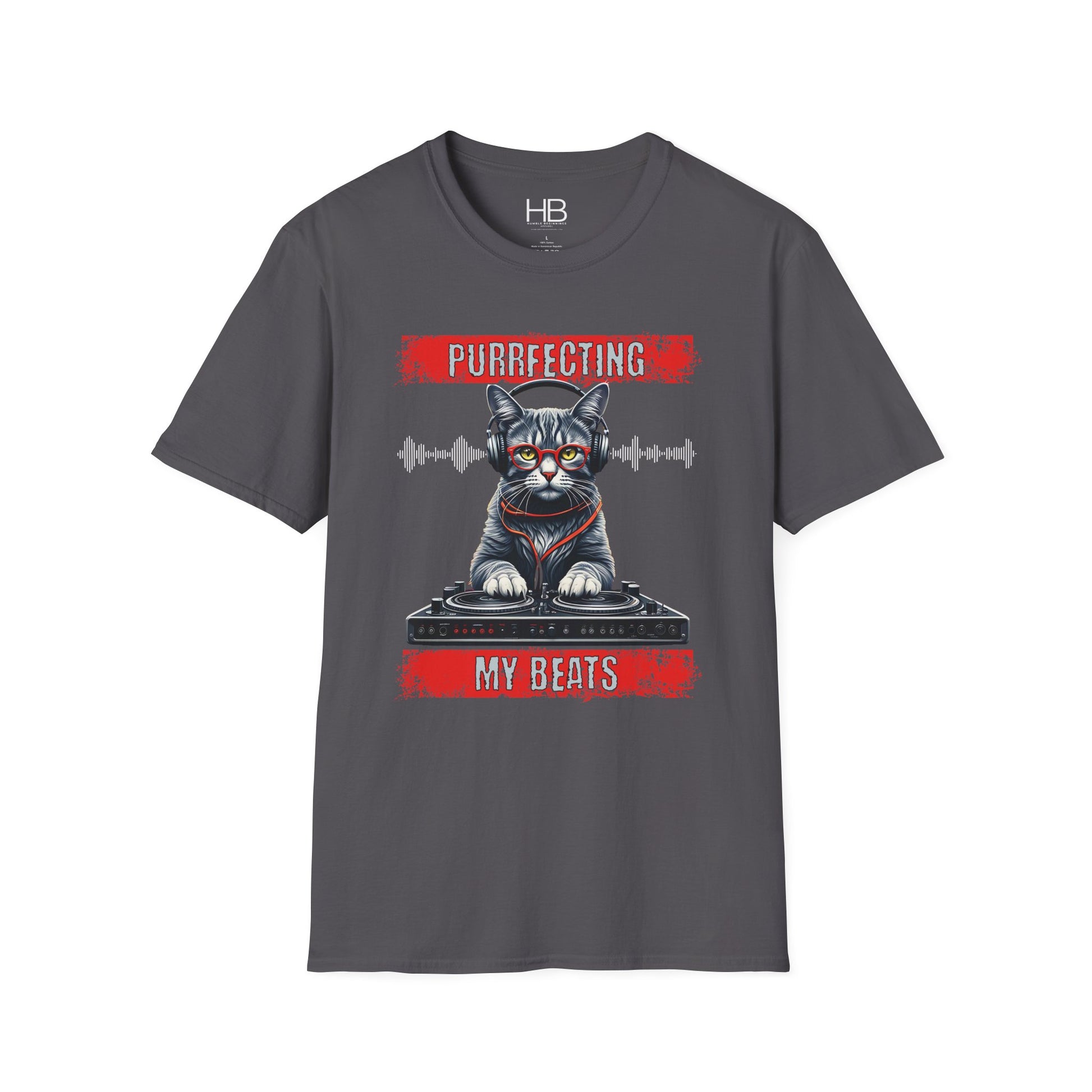 The Purrfecting My Beats unisex soft-style t-shirt puts a new spin on casual comfort. Made from very soft materials, this tee is 100% cotton for solid colors. Heather colors and sports grey include polyester. The shoulders have twill tape for improved durability. There are no side seams. The collar is made with ribbed knitting to prevent curling damage.